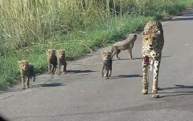 Earlier today, I witnessed an unforgettable sight in Kruger National Park — a mother cheetah walking right down the main road with her five adorable cubs in tow. It was both heartwarming and awe-inspiring. What made this moment even more remarkable was noticing that the mother appeared to have an injured leg. Yet, she wasn’t limping; she walked on it normally, which suggests it might just be a minor flesh wound. Hopefully, as long as she can keep it clean by licking it, the risk of infection will be minimal.