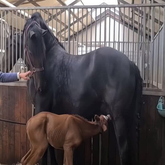 Then, fate stepped in. Across the farm, a newborn foal had lost his mother. Weak and confused, the orphan cried for the comfort only a mother could give. Carefully, the farmers led him to the grieving mare. At first, she sniffed him cautiously, her ears flicking. Then, as if understanding his pain mirrored her own, she wrapped her neck around him in the tenderest embrace.
