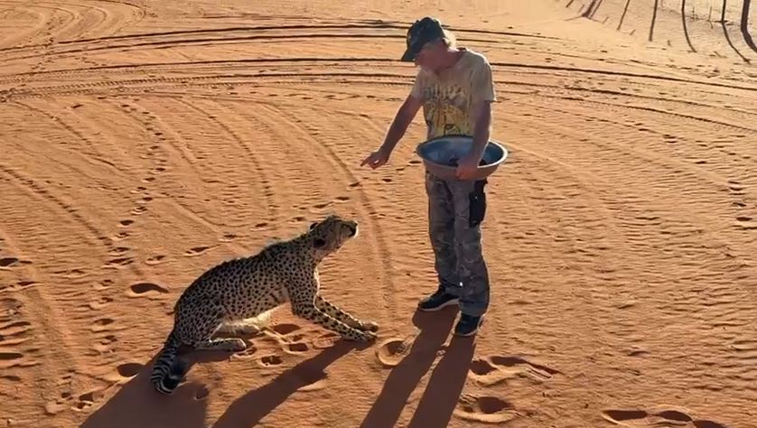 Cheetah feeding at Bagatelle Kalahari Game Ranch in Namibia offers a rare and captivating experience for wildlife enthusiasts. Set against the striking red dunes of the Kalahari Desert, the feeding takes place in a large, natural-style enclosure that spans about 12 hectares. The cheetahs here are not wild—they are rescued or orphaned individuals that, due to injury or upbringing in captivity, cannot be released back into the wild. However, they are given a safe and spacious environment where they can live out their lives with dignity.