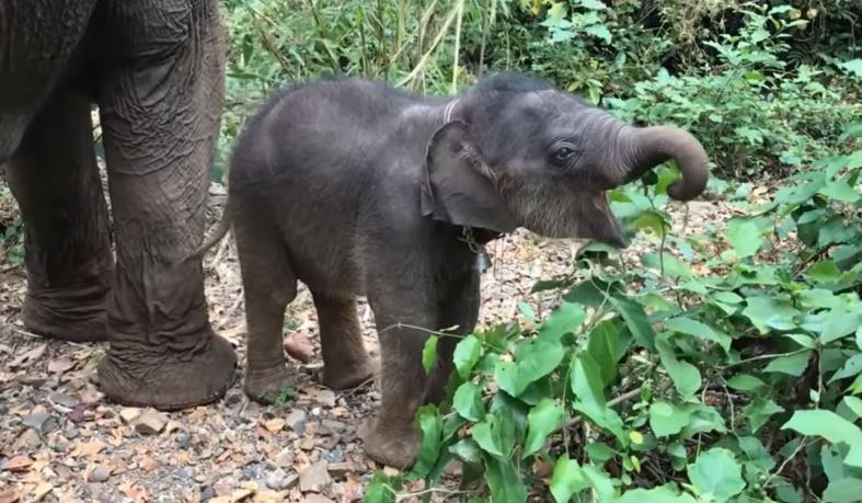 Copying Mom: Cute Elephant Calf Learns to Eat Solid Food