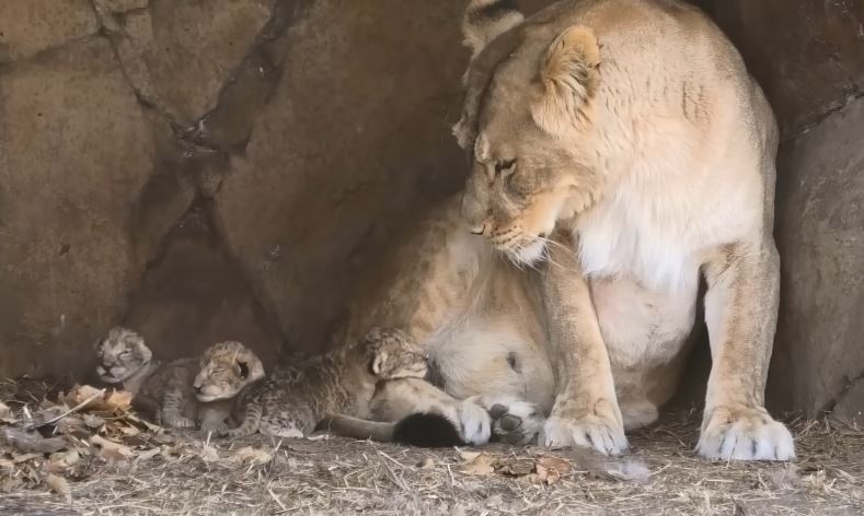 But against all odds, the lioness not only survived—she thrived. Now, her three tiny cubs, each no bigger than a loaf of bread, are mewing softly and nestled close to their mother, who watches over them with a protective, calm gaze.