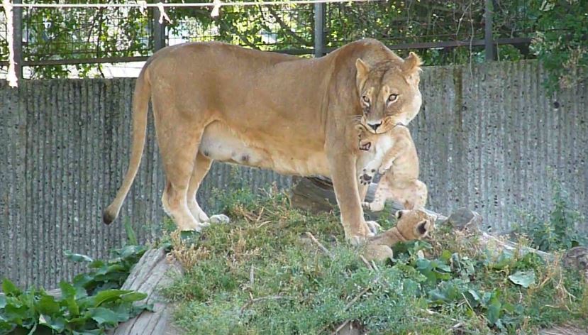 She shows off her cub. That area is terribly small. Poor the lioness and her cubs in such uncomfy Place.