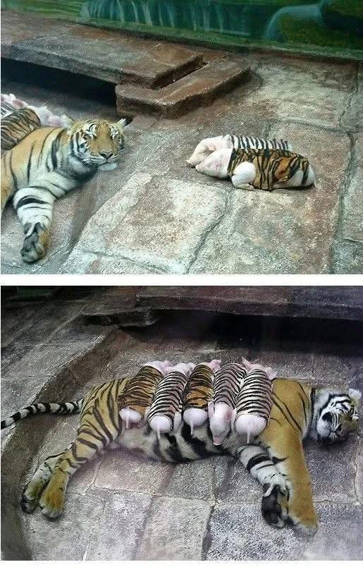 Determined to save her, the zoologists devised an unconventional plan rooted in empathy and biology. They wrapped several tiny piglets in soft, tiger-print cloth, transforming them into surrogate cubs. The moment the piglets were placed near her, something extraordinary happened. The mother tiger, recognizing the warmth and helplessness of the small creatures before her, responded with instinctive tenderness. She approached them cautiously at first, sniffing and circling, but within moments her maternal instincts surged back to life. She gathered the piglets close, grooming them as though they were her own lost offspring.