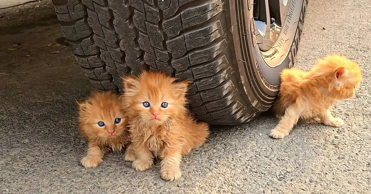 It started as an ordinary afternoon. Emily had just finished grocery shopping and was loading bags into the trunk of her car when she noticed a small movement near the front tire. Crouching down, she found three tiny kittens huddled beneath the car, wide-eyed and trembling. Their fur was dusty, and they looked barely old enough to be away from their mother.