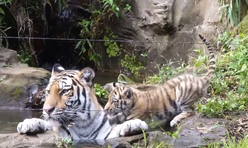 Keisuke was born in captivity as part of the zoo’s conservation program, and keepers have watched him grow into a healthy, spirited cub. On this particular day, the sun shone brightly, and the pond area provided the perfect setting for Keisuke’s latest adventure. With small but confident steps, the striped cub led his mother to the edge of the water, occasionally glancing back to ensure she was following. His mother, calm and protective, kept a watchful eye on her son while allowing him to explore.