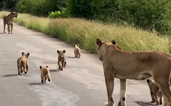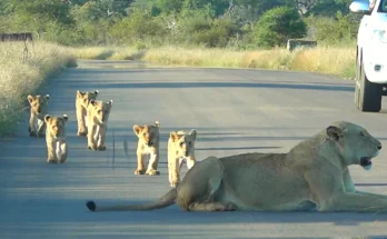 On a sun-drenched morning along the scenic road from Skukuza to Tshokwane in Kruger National Park, an unforgettable wildlife moment unfolded near Leeupan. Two lionesses, likely sisters or part of …