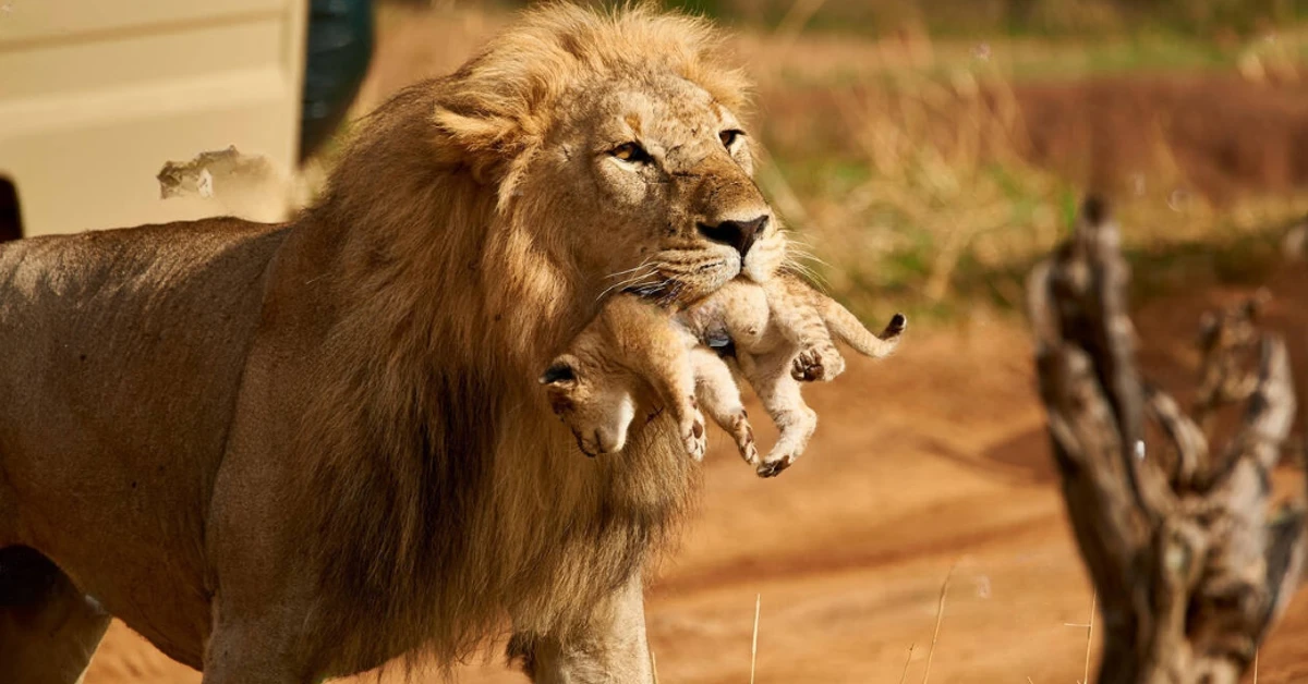The cub, barely the size of one of his massive paws, wriggles slightly but trusts completely. Tucked gently between his father’s powerful teeth, the little one is cradled with a surprising delicacy. Each step the lion takes is careful and deliberate, protecting his precious child from harm—from thorns, predators, or even his own weight. His golden mane glistens in the sunlight, but it’s the love in his amber eyes that captures the heart.