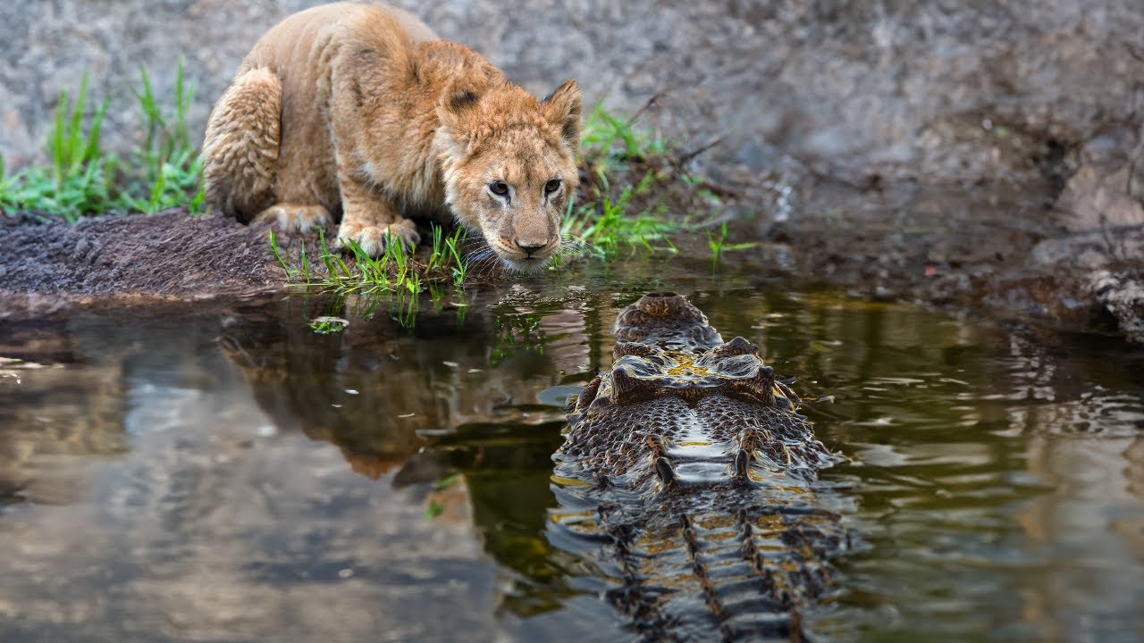 In the heart of the African savannah, survival is a daily challenge, especially for the young and vulnerable. One such moment unfolds as a lion cub approaches the edge of a slow-moving river. The sun casts golden reflections on the water, but beneath the calm surface lurks a hidden danger—a crocodile, still and watchful, blending seamlessly with its surroundings. The lion cub, perhaps separated from its pride or simply exploring its environment, steps cautiously into the water. Its small frame and uncertain movements betray its inexperience. The river, though not wide, is deep enough to be treacherous, especially with a predator nearby.