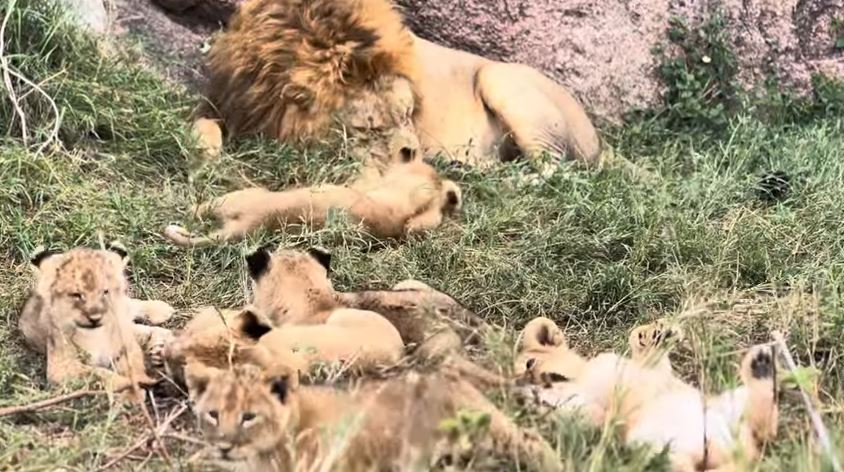 As the cubs grow bolder, they nuzzle against him, tug at his mane, and crawl over his massive paws. Moments like these reveal the tender instincts hidden beneath his powerful exterior. Occasionally, he lowers his head to gently push a cub back into place or offers a low, reassuring grunt that seems to calm them instantly. The interaction is both playful and protective, a reminder that even the most formidable animals possess a profound capacity for affection.