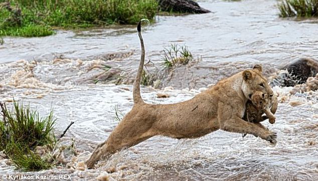 Together, they reach the opposite bank. The cub scrambles up onto solid ground, soaked and panting, but triumphant. The lioness licks his fur dry, her touch both tender and proud. It is a simple moment in the wild, yet deeply profound—a mother’s love and a young lion’s first test of strength.