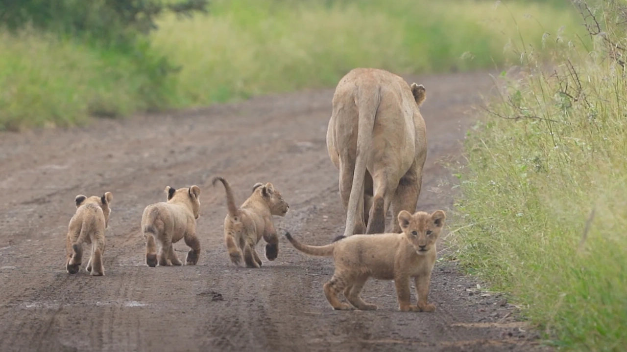When I arrived, I was met with the most heart-melting scene: the lioness and her four tiny cubs standing in the road near a puddle. Soon, they began moving along the road. The cubs were so young they hadn’t yet figured out how to properly walk — everything was a bounce, a hop, a clumsy little run. Watching their joy and liveliness was one of the cutest things I’ve ever seen.