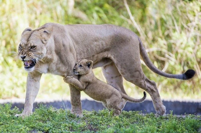 In response, the lioness adopts a fiercely protective stance. She uses her agility and strength to shield her cubs from the male lion’s advances or aggression. Lionesses often move the cubs to safer locations, hide them in dense vegetation, and remain vigilant for signs of danger. If the male shows aggression, the lioness may stand her ground, roaring loudly to warn him and rally other females to her defense. Sometimes, she confronts the male directly, using her powerful limbs and sharp claws to defend her young.