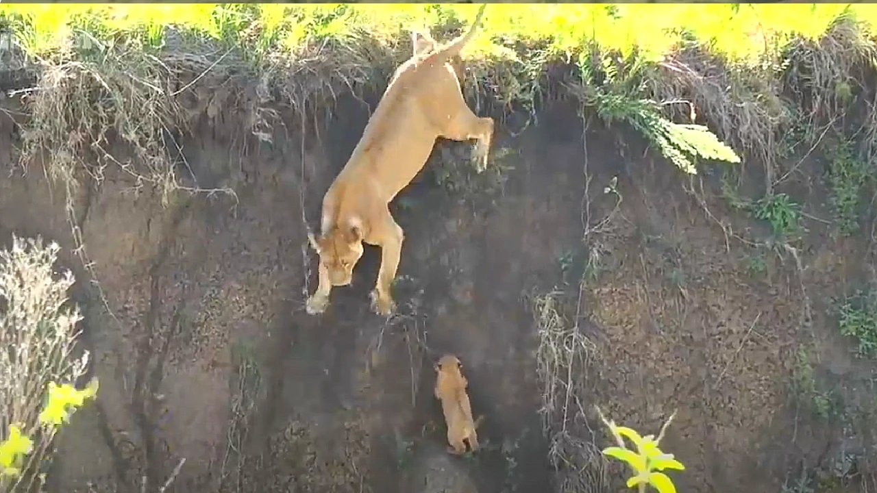 In the chaos of the standoff, the cub panics and scrambles away—but finds itself in deeper trouble. The little one slips and slides down a steep, muddy slope, becoming stuck on the slick edge of a ravine. The lioness, torn between fending off the male and rescuing her cub, faces a heartbreaking dilemma. She peers down anxiously, pacing the ridge as the cub cries out from below, its tiny paws unable to gain traction.