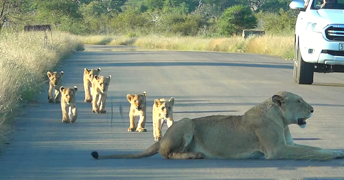 Visitors to Kruger National Park in South Africa were recently treated to a heartwarming and unforgettable sight: a lioness and her six playful cubs casually blocking the road, completely unbothered by the line of safari vehicles waiting behind them.