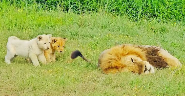 The tiny trio—Leo, Zazu, and Nala—were full of energy and curiosity. Having already chased butterflies and pounced on each other all morning, they now turned their attention to their napping father. His enormous paws twitched slightly as he snored, completely unaware of the chaos about to unfold.