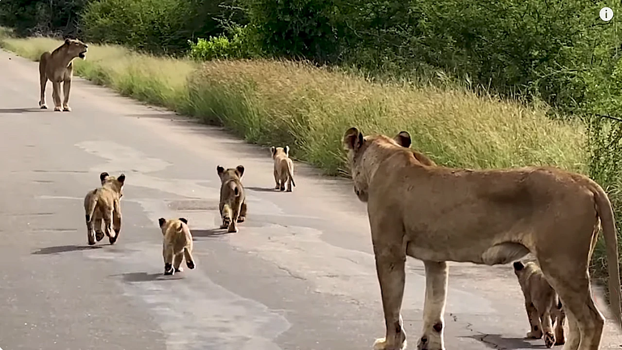 On a sun-drenched morning along the scenic road from Skukuza to Tshokwane in Kruger National Park, an unforgettable wildlife moment unfolded near Leeupan. Two lionesses, likely sisters or part of the same pride, met unexpectedly in the middle of the road — and they weren’t alone. Accompanying them were their tiny, playful cubs, no more than a few weeks old, full of curiosity and energy.