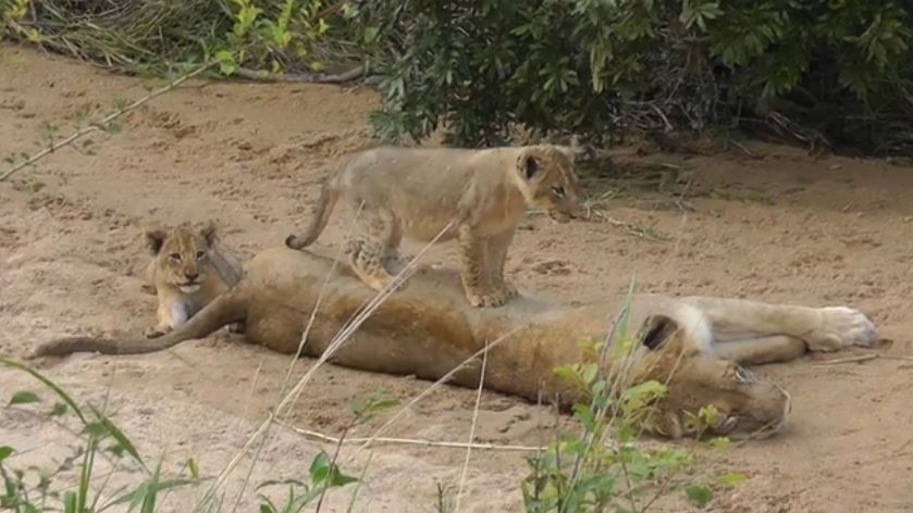 This tender scene is more than just a moment of fun; it is part of the deep bond shared between mother and offspring. As the cubs play, they’re not only burning off energy, but also practicing the skills they’ll one day need for hunting and survival. For now, though, they are safe—tucked in the heart of their pride, protected by a mother who gives them both strength and the freedom to grow.
