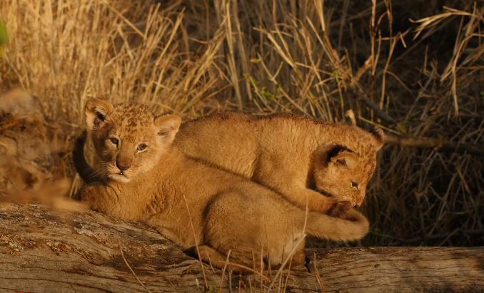 Still clumsy on their small paws, the cubs chase each other through tufts of dry grass, pouncing, rolling, and playfully swatting with their little claws. Their soft roars—more like squeaks—echo gently in the air, full of life and curiosity. Every leaf, shadow, and buzzing insect becomes a new discovery in their ever-expanding world.