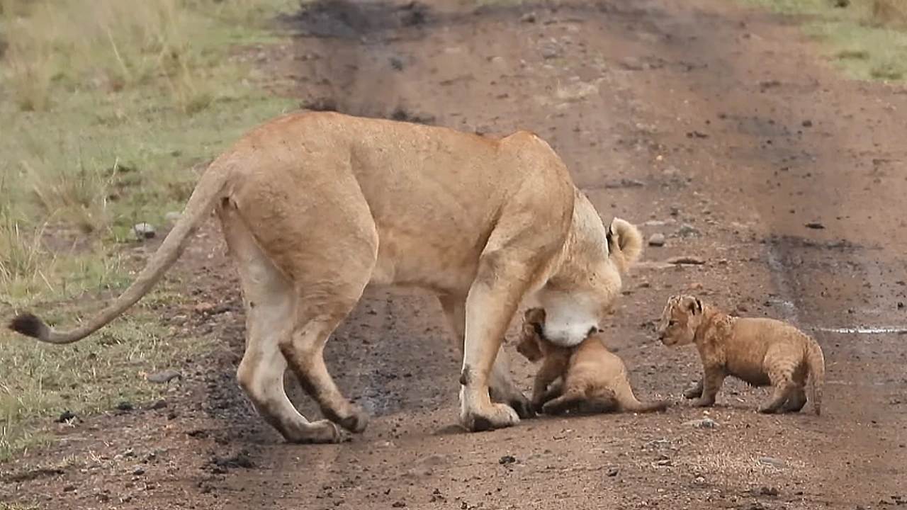 In the heart of the African savanna, under the soft glow of the morning sun, a heart-melting moment unfolds—two tiny lion cubs take their very first steps on a dirt road, closely following their mother. It’s a big day for the little ones, and every wobbly step is filled with curiosity and wonder.