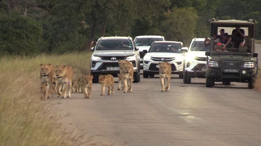Recently, a beautiful pride of lions, made up of five lionesses and ten cubs of various ages, was spotted walking along the road near Ngotso, north of Satara Rest Camp in Kruger National Park. They created a natural roadblock, leisurely strolling for an extended period and preventing vehicles from passing. This behavior isn’t unusual for this pride; they’ve been seen using the roads in this area before.